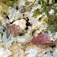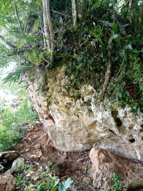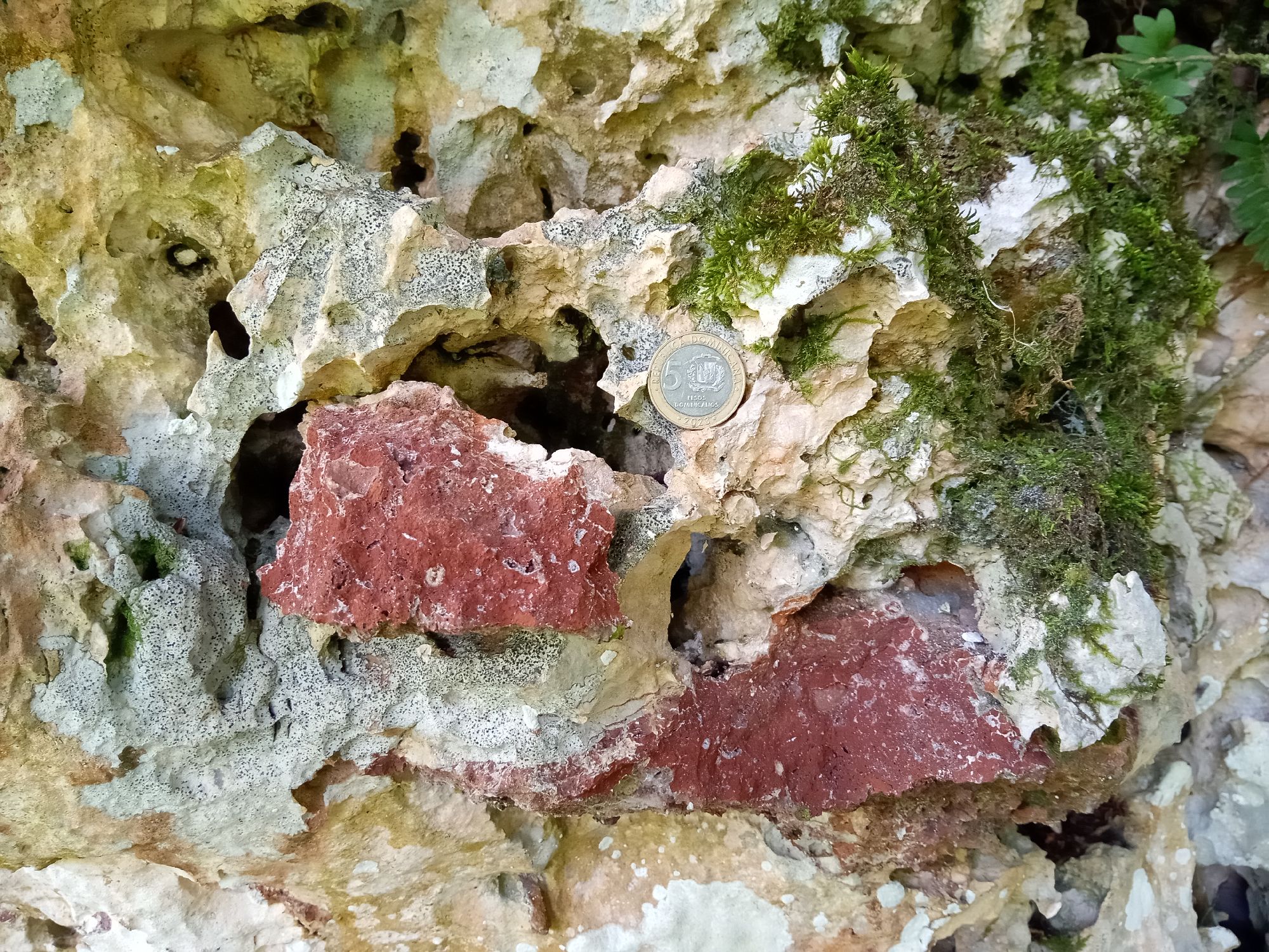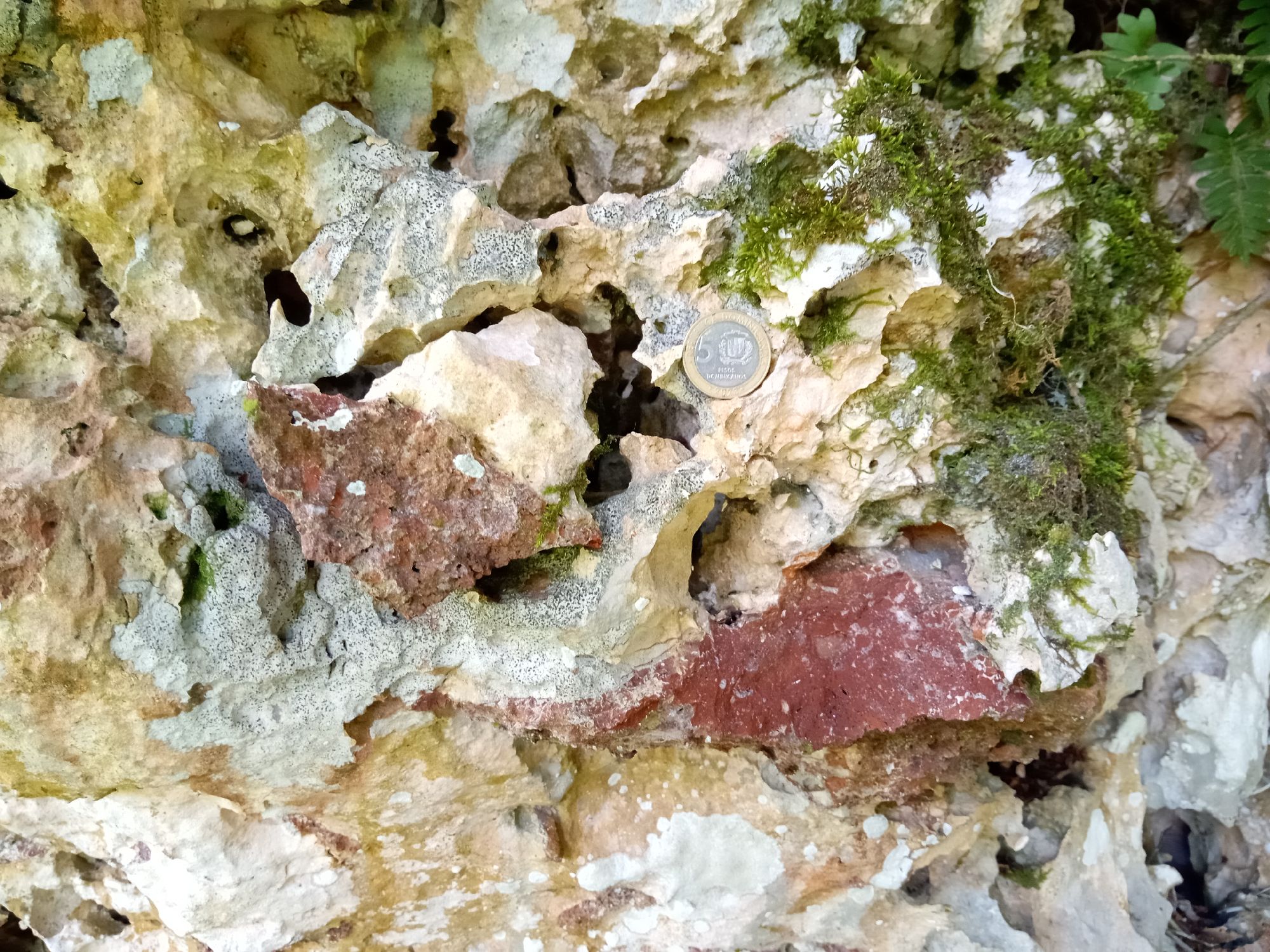 - Bloque de caliza arrecifal karstificada, colonizado, zapado, con concreciones de laterita litificada. Formación Los Haitises