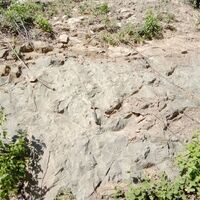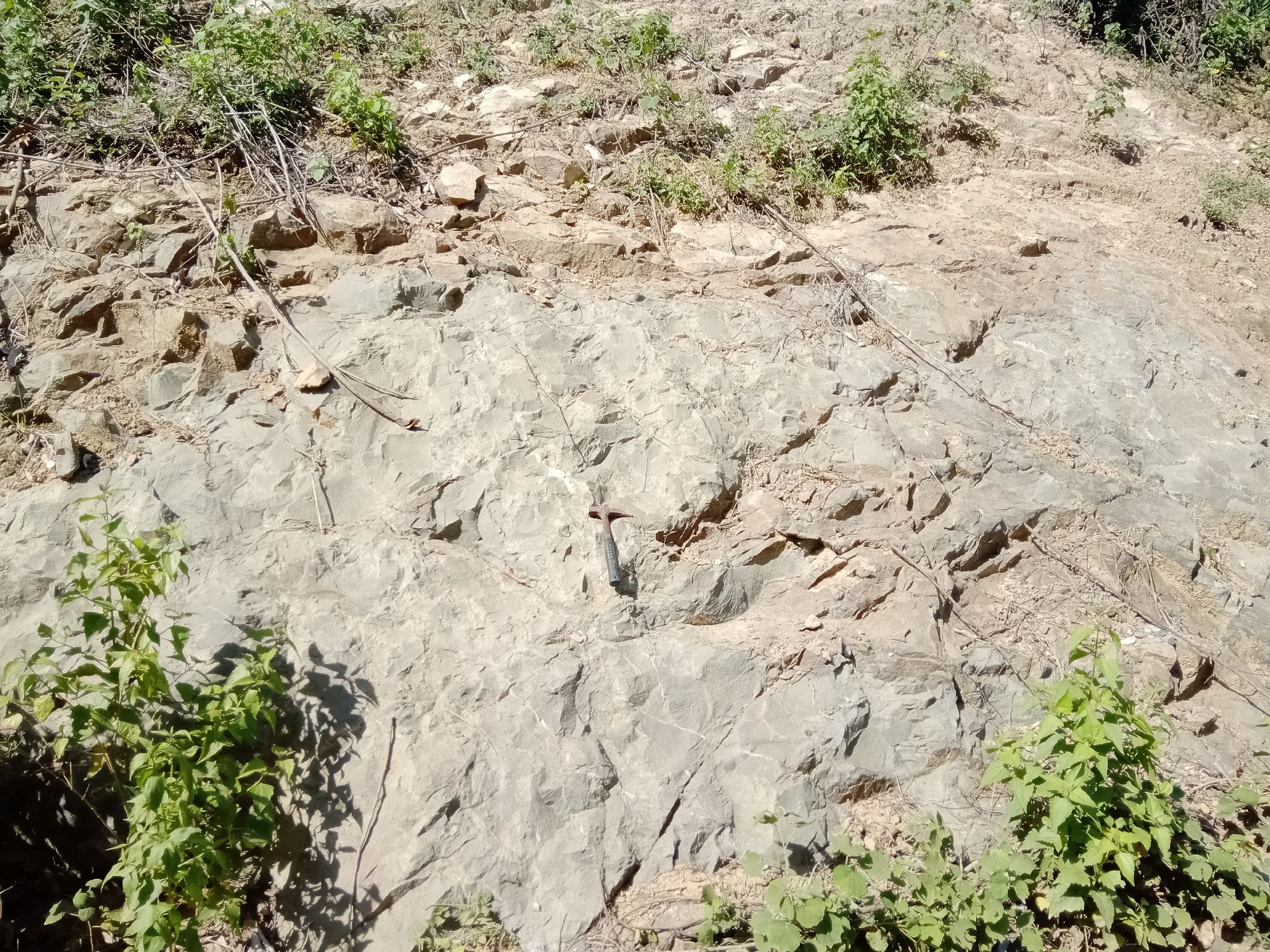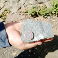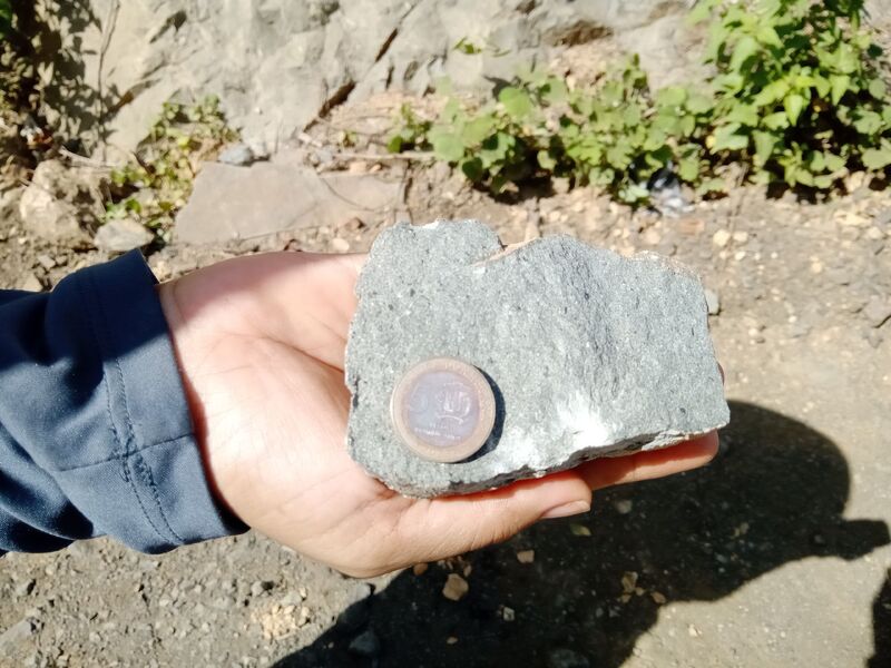 Afloramiento de ignea intrusiva, cf. tonalita, u otra, cerca de El Puerto. De forma suprayacente, paquete de posibles lutitas muy alteradas. En el geológico este afloramiento aparece como conglomerado de rocas volcánicas. La obtención de la muestra de mano fue bien difícil, por ser extremadamente competente.